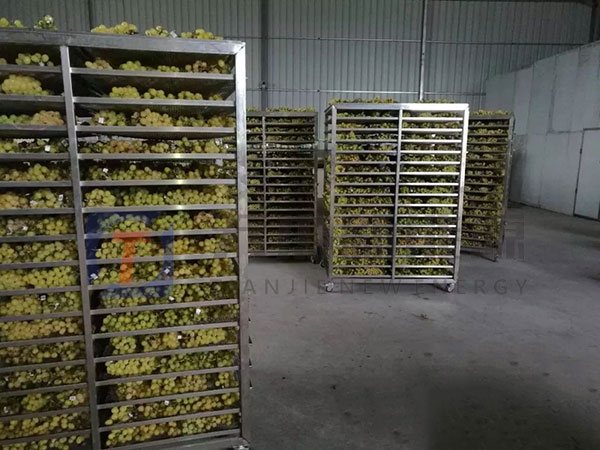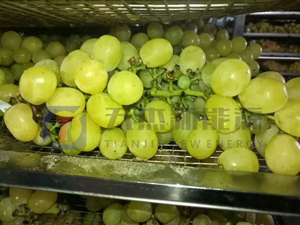 烘干:將洗好的葡萄放入葡萄籽烘干設(shè)備托盤(pán),物料車(chē)擺放好后推進(jìn)葡萄烘干房。葡萄烘干機(jī)初溫45~50℃,終溫70~75℃;烘干時(shí)間42~60h,系統(tǒng)排濕量要大,脫水率已達(dá)70%。全干后仍保持綠色。葡萄籽烘干設(shè)備烘干適度的葡萄干,肉質(zhì)柔軟,用手緊壓無(wú)汁液滲出。含水量為 15%~17%,干燥率為3:1~4:1。