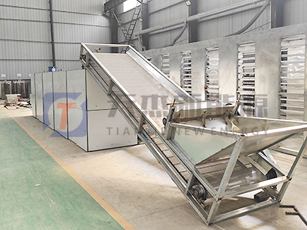 4、燙后將山楂片鋪排在山楂烘干機(jī)輸送口處,推入山楂切片烘干一體機(jī)